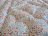 This gorgeous eiderdown has the loveliest paisley "duck egg" designed by the very talented Sarah Hardaker in pink roses and on a soft blue ground, the fabric on the underside is a pretty blue stripe blue with the piped edge also in blue stripe.